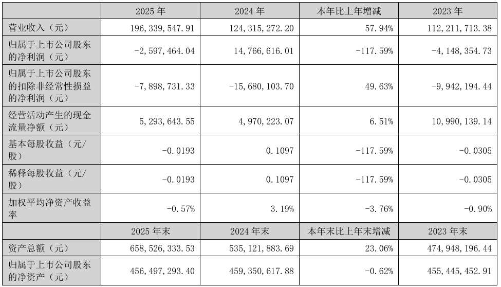 4月24日,佛山市南华仪器股份有限公司正式发布2025年年度报告。年报显示,2025年南华仪器实现营业总收入1.96亿元,同比增长57.94%;归属于上市公司股东的净利润-0.03亿元,同比下降117.59%;归属于上市公司股东的扣除非经常性损益的净利润-0.08亿元,同比减亏49.63%;经营活动产生的现金流量净额0.05亿元,同比增长6.51%。