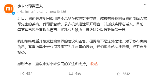 4月26日上午,@小米公司发言人微博账号发文,表示近日,我司关注到网络用户李某华在微信群中捏造、散布有关我司及我司创始人雷军先生的谣言。我司报警后,公安机关迅速展开调查,并抓获实际造谣人。目前,李某华已因故意散布谣言、扰乱公共秩序,被依法处以行政拘留十日。