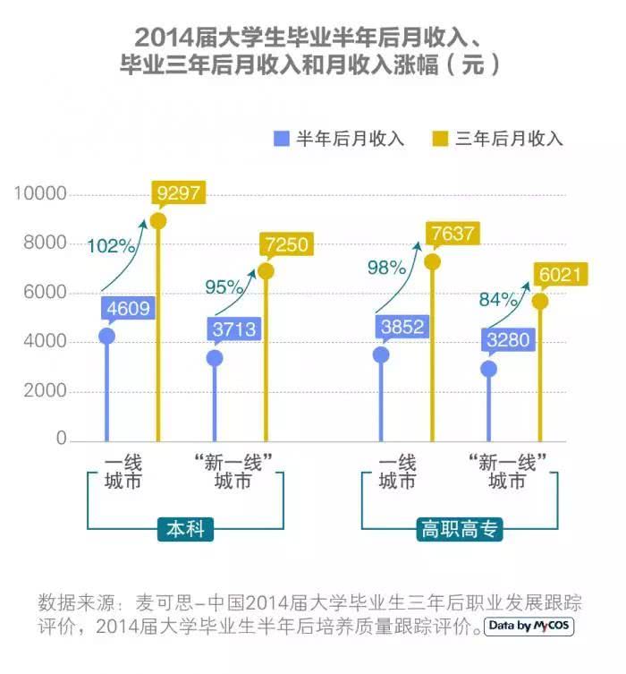 麦可思数据显示,在一线城市就业的2014届本科生毕业三年后月收入从4609元增长到9297元,涨幅为102%;高职高专生的月收入从3852元增长到7637元,涨幅为98%。