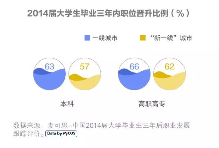 同时,63%在一线城市就业的本科生毕业三年内职位获得了晋升,高于“新一线”城市6个百分点。66%在一线城市就业的高职高专生得到晋升,高于“新一线”城市4个百分点。