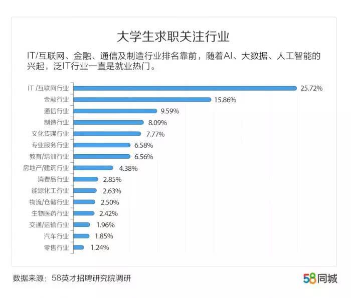 从大学生求职首选行业来看,IT/互联网、金融、通信及制造行业排名靠前,随着AI、大数据、人工智能的兴起,泛IT行业一直是就业热门,而金融、通信行业由于收入高、工作环境好,成为大学生心目中的理想选择。