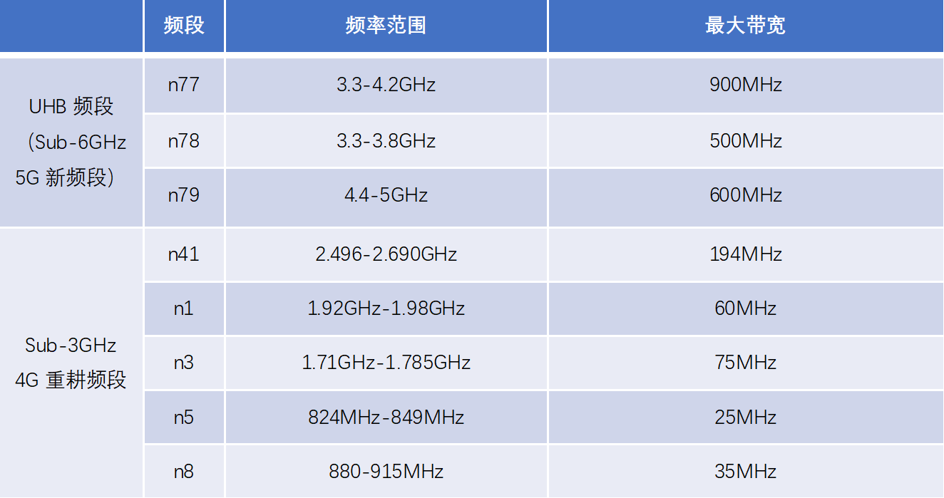 1、位于Sub-3GHz的n41/n3/n1/n8/n5等,是在原来4G频段上做的重耕,带宽窄。