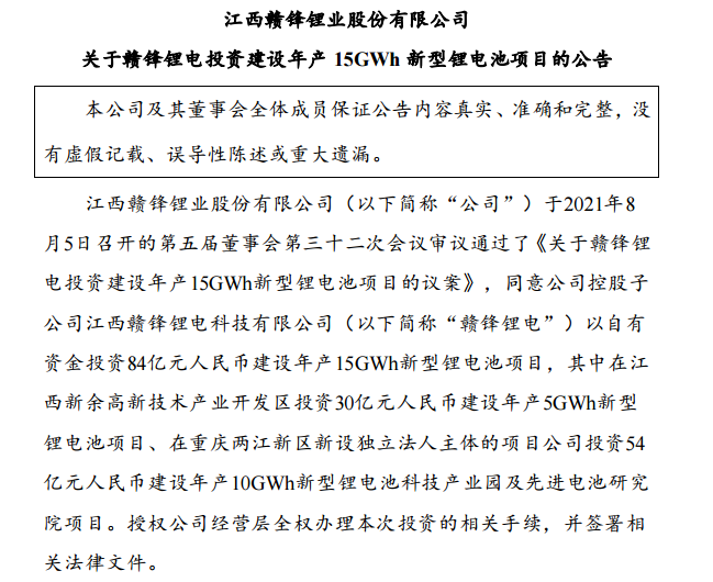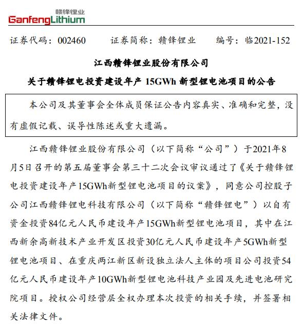 赣锋锂业8月5日晚间公告,子公司拟以自有资金投资84亿元建设年产15GWh新型锂电池项目。其中,在江西新余高新技术产业开发区投资30亿元建设年产5GWh新型锂电池项目;在重庆两江新区新设独立法人主体的项目公司投资54亿元建设年产10GWh新型锂电池科技产业园及先进电池研究院项目。