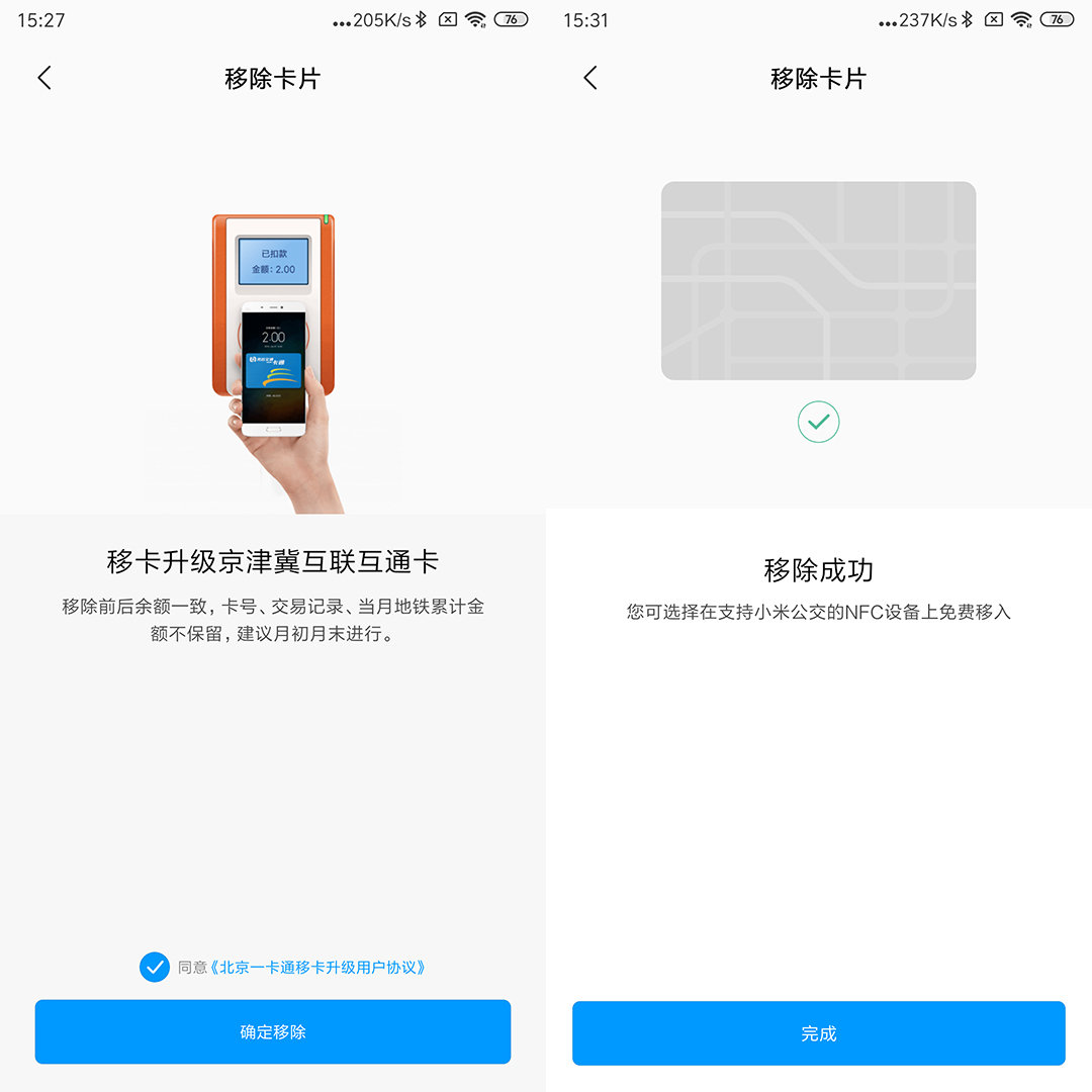 在“旧手机”小米公交的公交卡界面点击“更多操作”里面“移除卡片”按钮,同意《北京一卡通移卡升级用户协议》,点击“确定移除”以后就正式开始移卡操作,只需等待片刻就可以移除成功。