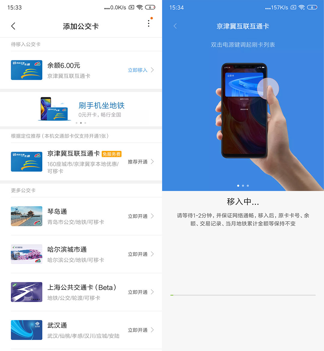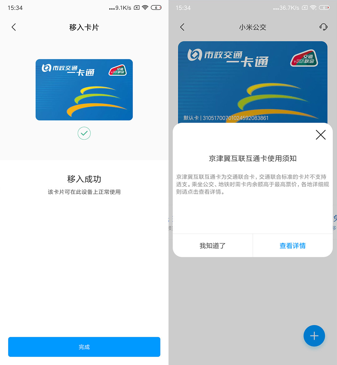“新手机”登录相同的小米账号,在 “添加公交卡”界面会出现一个显示余额的京津冀互联互通卡选项,这张就是之前移除的北京一卡通。点击“立即移入”稍等片刻移入成功。这样我们就成功得将北京市政交通一卡通通过移卡升级的方式替换为京津冀互联互通卡。