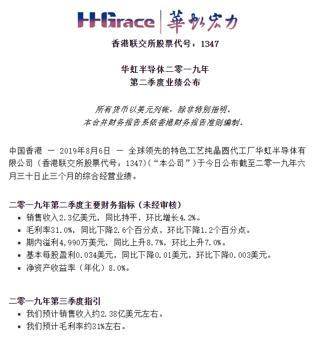 8月6日,华虹半导体发布公告,今年第二季度销售收入2.3亿美元,同比持平,环比增长4.2%;毛利率为31.0%,同比下降2.6个百分点,环比下降1.2个百分点;期内溢利4,990万美元,同比上升8.7%,环比上升7.0%。