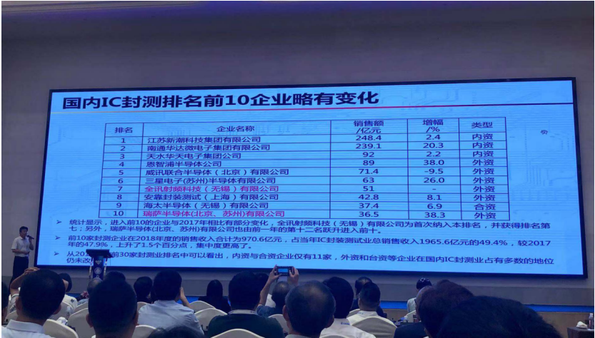 在封测企业方面,Top10排名较2017年略有变化,全讯射频科技(无锡)有限公司首次进入榜单,并排名第7,瑞萨半导体(北京、苏州)有限公司,由前一年的12名跃升到前10;通富微电、西安中车永电、华天科技(昆山)、苏州晶方半导体4家企业的创新技术入选“2018年中国半导体创新产品和技术的IC封测与测试技术”榜单。
