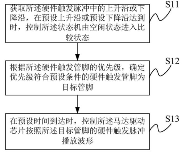 如上图所示为LRA马达驱动芯片的控制方法的流程示意图,该控制方法应用于马达控制系统。其中,马达控制系统包括马达驱动芯片,马达驱动芯片包括状态机以及增益控制寄存器,且马达驱动芯片包括至少一个硬件触发管脚,同时每个硬件触发管脚对应一个硬件触发脉冲,状态机包括空闲状态、比较状态以及波形播放状态。