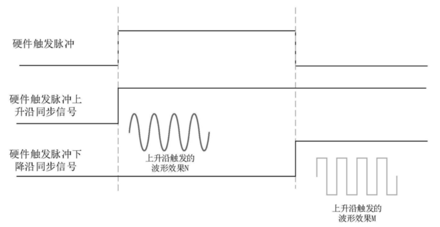 当触发方式为双边沿触发时,在硬件触发脉冲的上升沿和下降沿分别产生硬件触发脉冲上升沿同步信号和硬件触发脉冲下降沿同步信号,根据设置的上升沿波形序列号和下降沿波形序列号,分别播放对应的波形效果。