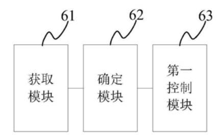 如上图所示为LRA马达驱动芯片的控制装置的结构示意图,控制装置包括获取模块、确定模块以及第一控制模块。获取模块61,用于获取硬件触发脉冲中的上升沿或下降沿,在预设上升沿或预设下降沿达到时,控制状态机由空闲状态进入比较状态。