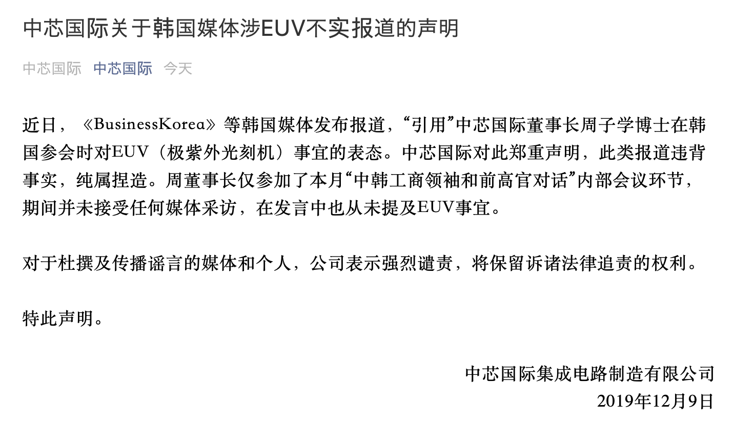 Statement From SMIC On False Reporting of Some Korean Media On EUV