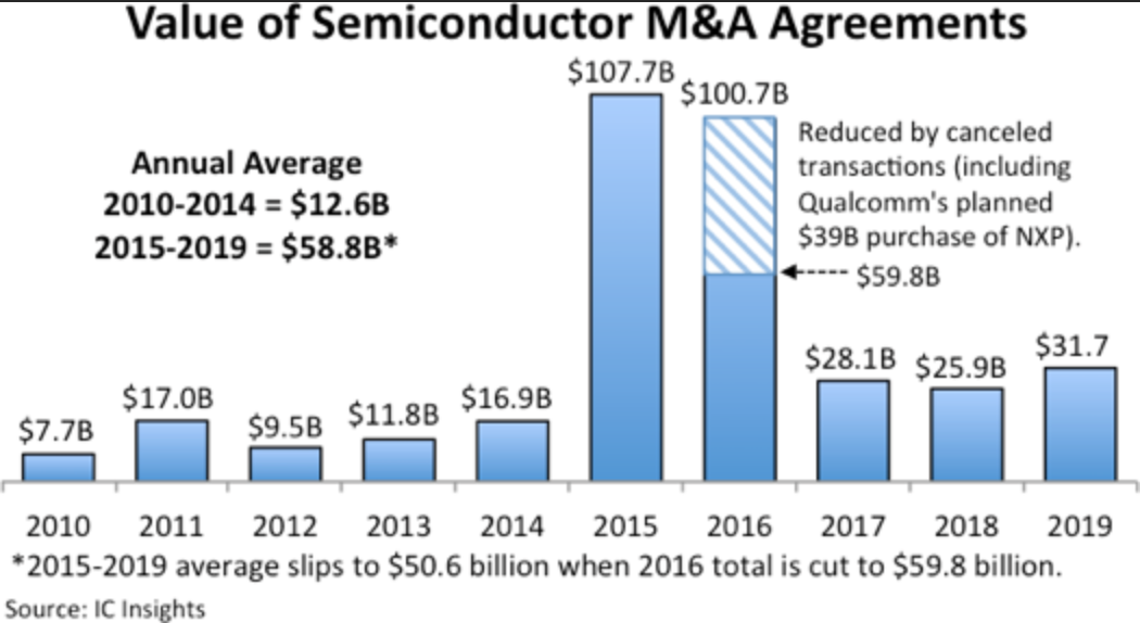 (文/Yuna)据集成电路行业分析机构IC Insights发布报告显示,2019年7项总计价值10亿美元以上的大型半导体收并购案推动行业交易总额同比增长22%。2019年也成为半导体行业史上第三大并购年。