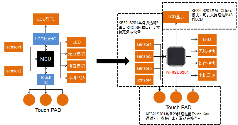 KF32LS201单芯片解决的能力更强,一颗可以替代传统的MCU+LCD+Touch 3颗IC,减少物料成本、BOM管理成本和生产成本。