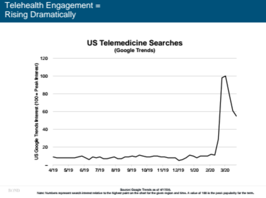 (谷歌引擎“远程医疗”的搜索情况,来源:Bond Capital) 财联社