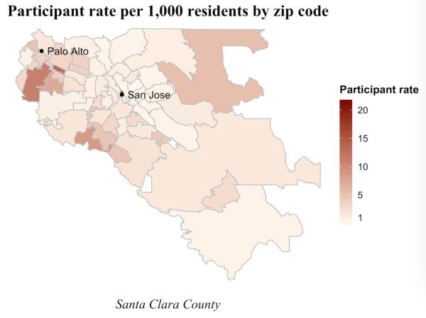 研究者通过Facebook广告招募测试参与者,招募广告根据人口统计学特征和地理分布等进行投放。研究者在3330人的样本中报告了SARS-CoV-2的抗体的流行程度,并根据性别、种族/民族、邮编等进行了调整。