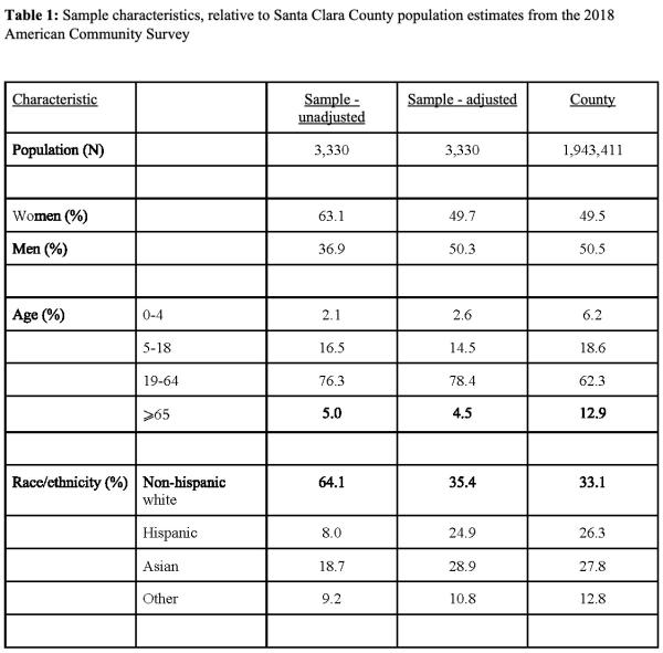 以下表格包含未调整样本,人口调整样本和圣克拉拉的人口统计学特征: