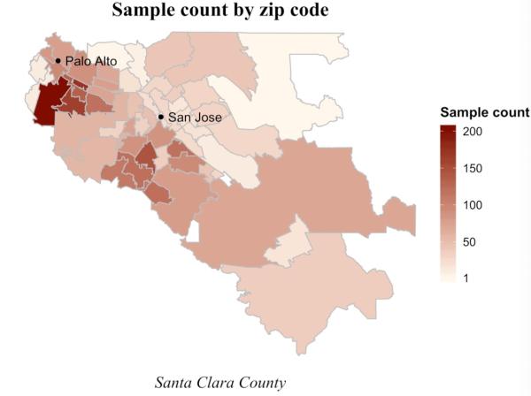 不过样本并不完美,其不是随机抽样,其分布在几个方面与圣克拉拉县有明显偏差:性别(样本63%是女性,该县是50%);种族(样本8%为西班牙裔,该县是26%;样本19%为亚裔,该县是28%)。