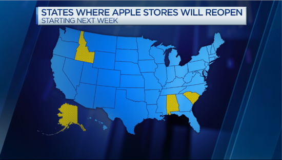 苹果代表在一份声明中说:“我们对下周开始在美国重开部分门店倍感兴奋,首先恢复营业的是爱达荷州、南卡罗来纳州、阿拉巴马州和阿拉斯加的一些门店。我们的团队一直在审查当地的健康数据和政府指导,一旦可以安全恢复营业,我们就会马上行动。”