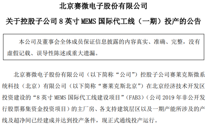 公告披露,赛微电子控股子公司赛莱克斯微系统科技(北京)有限公司(以下简称“赛莱克斯北京”)在北京经济技术开发区投资建设的“8 英寸 MEMS 国际代工线建设项目”(FAB3)的主厂房、各支持建筑层区以及一期产能所涉及的产线及超净间已经建成并达到投产条件。