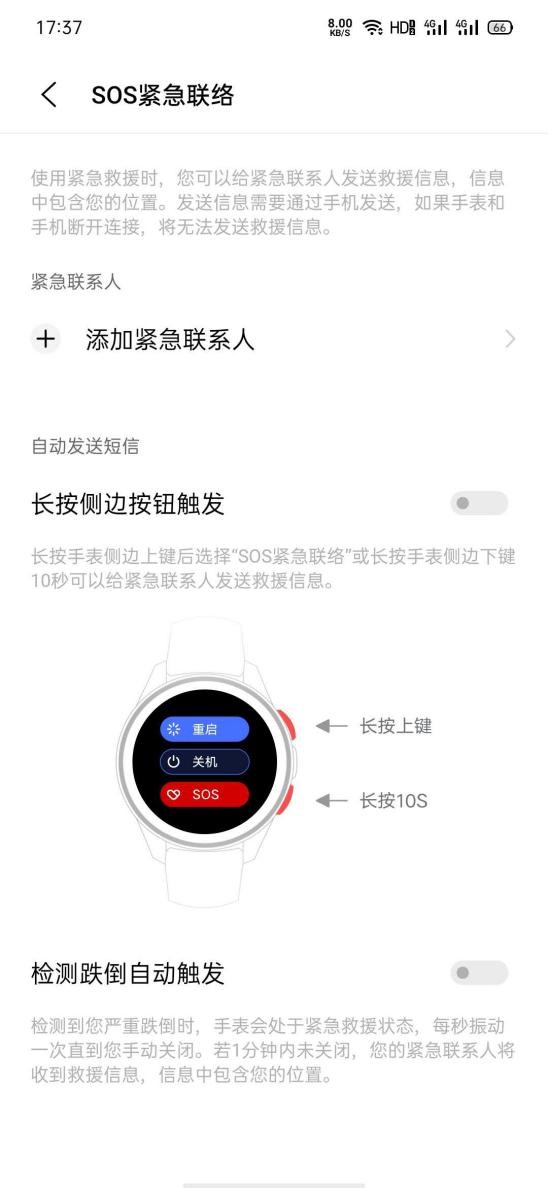 除了检测身体状况以外还包括紧急救援功能,当手表监测到佩戴者严重跌倒情况时,会开启紧急救援状态,如果在一分钟内没有退出震动提醒,则会发送包含地理位置的救援短信给紧急联系人。这个功能很适合独居人群或者家里的老人使用。