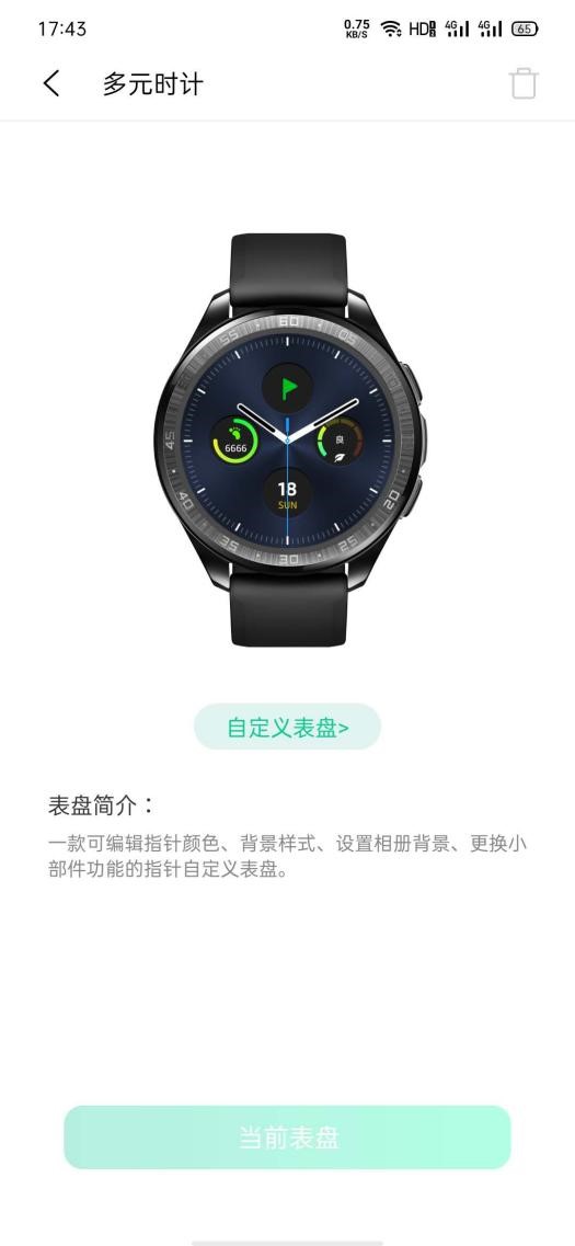 vivo WATCH正面采用1.39英寸AMOLED高清显示屏,分辨率为454x454,像素密度326 PPI,vivo还提供了诸多潮流炫酷的表盘设计,手指按住屏幕不动就可以转换表盘,也可以通过APP端进行调整。