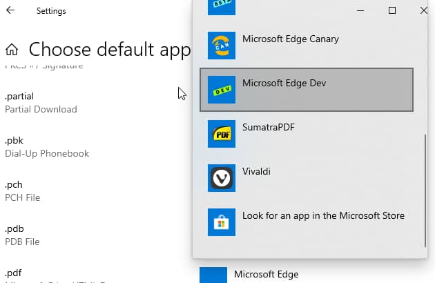 3.向下滚动直到找到“ .pdf”,然后单击Microsoft Edge
