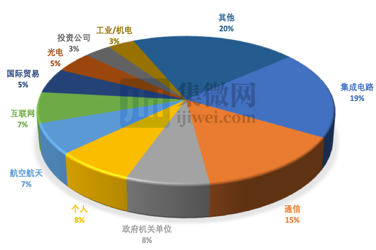 根据美国商务部官网资料,截至2019年12月13日,中国共有239家企业及个人被纳入“实体清单”(不包含中国台湾企业和外国附属公司),总数仅次于俄罗斯的316家。集微网对239家企业类型进行统计后发现,集成电路(19%)和通信(15%)两大领域占比最多,其次是政府机关(8%)、航空航天(7%)和互联网(7%)。另外,还有国际贸易、光电、投资公司、工业机械以及核能源相关企业。