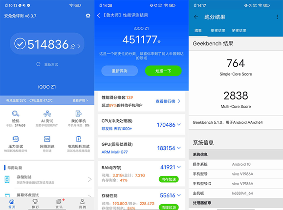 iQOO Z1搭载天玑1000Plus,采用7nm工艺,CPU方面采用4大核+4小核架构,包括:4个2.6GHz的Cortex-A77大核心, 4个2.0GHz的Cortex-A55小核心,相较于上一代性能提升20%;GPU方面为9核心的Mali-G77,相较于上一代G76性能提升40%,大幅提升图形和视频渲染能力,为用户带来更具沉浸感的影音娱乐和游戏体验。天玑1000Plus还在APU上进行了升级。天玑1000Plus的APU3.0相比前代的APU2.0性能提升了2.5倍,能效更提升了40%。在主流的测评软件中,安兔兔跑分为514836,鲁大师跑分451177,Geekbench 5单核跑分764,多核跑分2838。