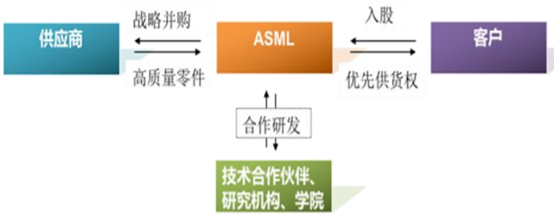 阿斯麦的成功除了内部不断加大研发外,外部也不断整合产业链资源来保持自己在行业内的核心地位。在客户方面,阿斯麦的三大客户英特尔、三星、台积电均是其股东,每年为阿斯麦注入大量资金,阿斯麦则给予股东优先供货权。通过客户入股使得阿斯麦与客户结成紧密的利益共同体,在共享股东先进科技的同时降低自身的研发风险;在供应商方面,阿斯麦通过战略并购与入股,快速打通上游供应链,快速攫取了光源、镜头等光刻机零件领先的技术,占据技术高地,进一步促进公司核心技术的创新;在外部技术合作方面,阿斯麦主导打造了囊括外部技术合作伙伴、研究机构、高等院校的巨大开放式研究网络,并通过建立特有的专利制度管理知识产权和研究成果。