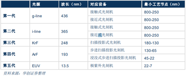 光刻机的不断发展满足了芯片更小制程、更低成本的生产要求。目前光刻机已经发展至第五代,采用波长 13.5n 极紫外光的 EUV 光源,可实现 7nm 工艺制程,技术要求极高,单台价值为 1.2 亿欧元,阿斯麦成为全球唯一一家能够设计和制造 EUV 光刻机设备的厂商。