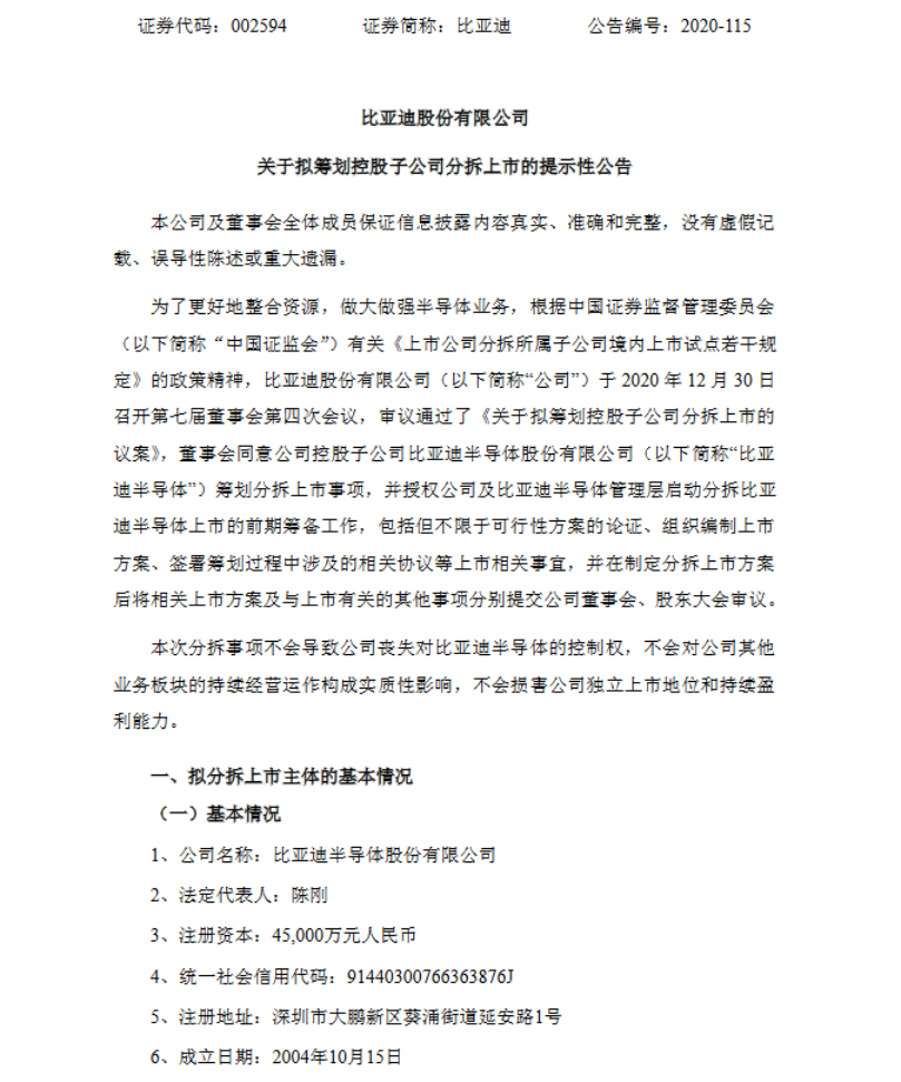 4.比亚迪:控股子公司比亚迪半导体筹划分拆上市