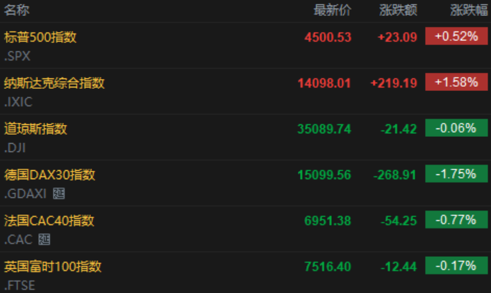 美股方面,上周三大股指纷纷收涨,道指上周累计涨幅达1.15%;标普500上周累计涨幅1.55%,纳指上周受科技股财报季影响开启过山车行情表现,上周四4.22%的跌幅创下2020年9月8日以来最大跌幅,上周五受成分股亚马逊财报提振市场信心因素,上周收涨1.30%。截止收盘,道指跌21.42点,跌幅为0.06%,报35089.74点;纳指涨219.19点,涨幅为1.58%,报14098.01点;标普500指数涨23.09点,涨幅为0.52%,报4500.53点。