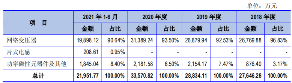 据招股书披露,网络变压器是美信科技的第一大业务,亦可称之为最为重要的收入来源。2018年至2021年上半年,该业务收入分别实现2.68亿元、2.67亿元、3.14亿元、1.99亿元,营收比重分别为96.83%、92.53%、93.50%、90.64%,营收占比超过九成。