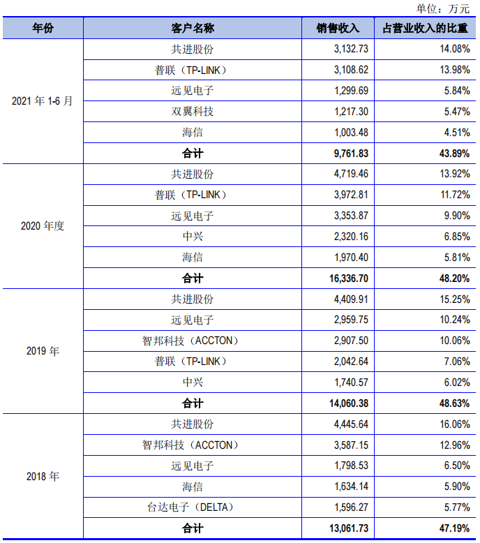 其中,共进股份始终是其第一大客户,贡献的销售收入分别为4445.64万元、4409.91万元、4719.46万元、3132.73万元。