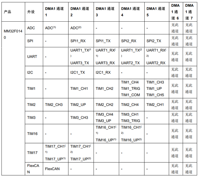 MM32F0140的DMA模块所支持的外设类型包括UART、I2C、SPI、ADC与通用、高级和基础定时器,当DMA从外设产生的请求通过逻辑或输入DMA控制器时,为避免冲突,在一个通道中,同时只能有一个外设DMA请求有效,详细各通道DMA请求如图1所示。