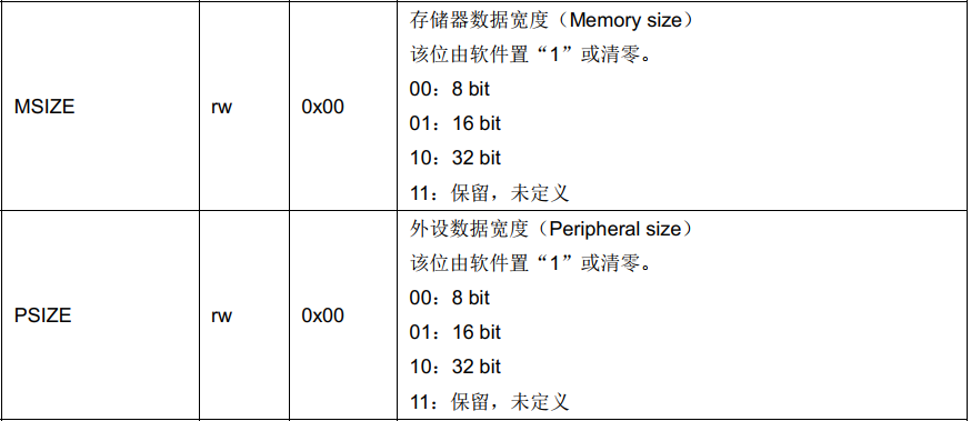 外设数据宽度配置由DMA通道x配置寄存器(DMA_CCRx)的PSIZE位控制,可配置为8bit, 16bit或32bit,MSIZE位与PSIZE位如图2所示。