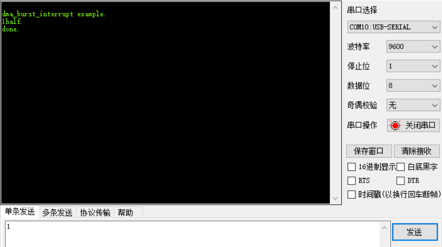 main()函数结合上述操作,初始化DMA,设置变量app_dma_xfer_done为传输完成标志,设置变量app_dma_xfer_half_done为DMA已传输一半的标志,设置数组app_dma_buff_from[]为源,即DMA传输时从该存储器地址加载数据,设置数组app_dma_buff_to[]为数据存储地址,设置变量DMA_BUFF_COUNT为数据传输数量,传输数量为16,每次传输后,该数值递减,当数值递减为0时,数据传输完毕,配置自动重加载模式,数据传输数量会被自动重新加载为之前配置时的数值。当检测到半传输中断标志产生,串口打印"half",检测到传输完成中断标志产生,串口打印"done"。本实验在串口输入数据时进行DMA传输,将源地址app_dma_buff_from[]中的数据通过DMA传输到app_dma_buff_to[]地址中。实验现象如图3所示。