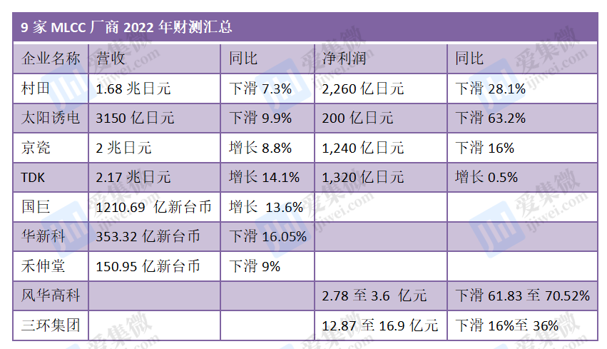集微网统计了9家MLCC厂商2022年的财测,由上表可知,2022年MLCC厂商业绩下滑为主要行业趋势,仅TDK实现了营收和净利双双增长,国巨也依靠多次并购完成对高端产品的布局,实现了营收的小幅度增长。净利润方面,除三家台湾厂商并未披露2022年净利润外,太阳诱电及风华高科净利润下滑的幅度最大。