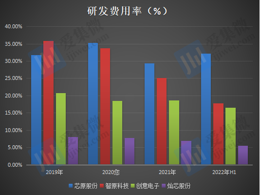 实际上,在研发费用金额与研发费用率方面,灿芯股份与同行相比均存在较大的差距!以研发费用率来看,2019-2022年上半年行业均值为25.14%、22.26%、19.02%、18.10%,其中芯原股份在行业的研发费用率最高,期间为31.72%、35.25%、29.37%、32.14%,研发费用金额更是高达2.66亿元、3.66亿元、4.2亿元、3.9亿元!