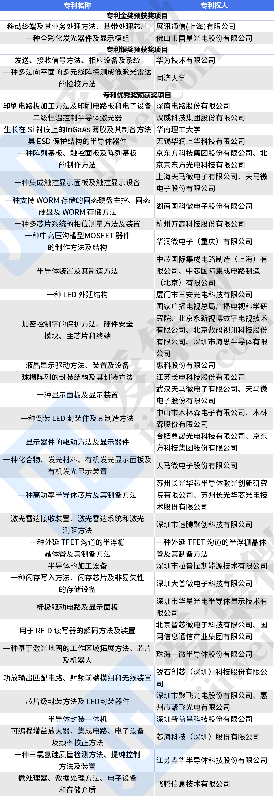 专利金奖预获奖项目中,包括展讯通信(上海)有限公司的“移动终端及其业务处理方法、基带处理芯片“专利,佛山市国星光电股份有限公司的“一种全彩化发光器件及显示模组”专利等。