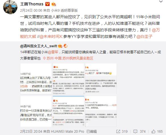王腾称:“一篇文章惹的某些人都开始挖坟了,见识到了公关水平的高超啊!11年小米刚问世,试问当时有几人看的懂?手机技术在进步,人的认知难道不能进化?说科普咱就好好科普,产品有问题搞挖坟这种下三滥的手段来转移注意力,真行!”