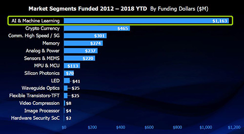 明导国际(Mentor)执行长Walden Rhines(图3)就指出,半导体购并浪潮冷却后,现在半导体领域的新创公司又开始大为活跃,并获得创投基金大量挹注。 根据明导汇整多家研究机构与自身研究团队的数据指出,AI跟ML是2012~2018年期间,创投基金对半导体新创公司挹注金额最多的应用领域,总金额达到11.63亿美元(图4)。