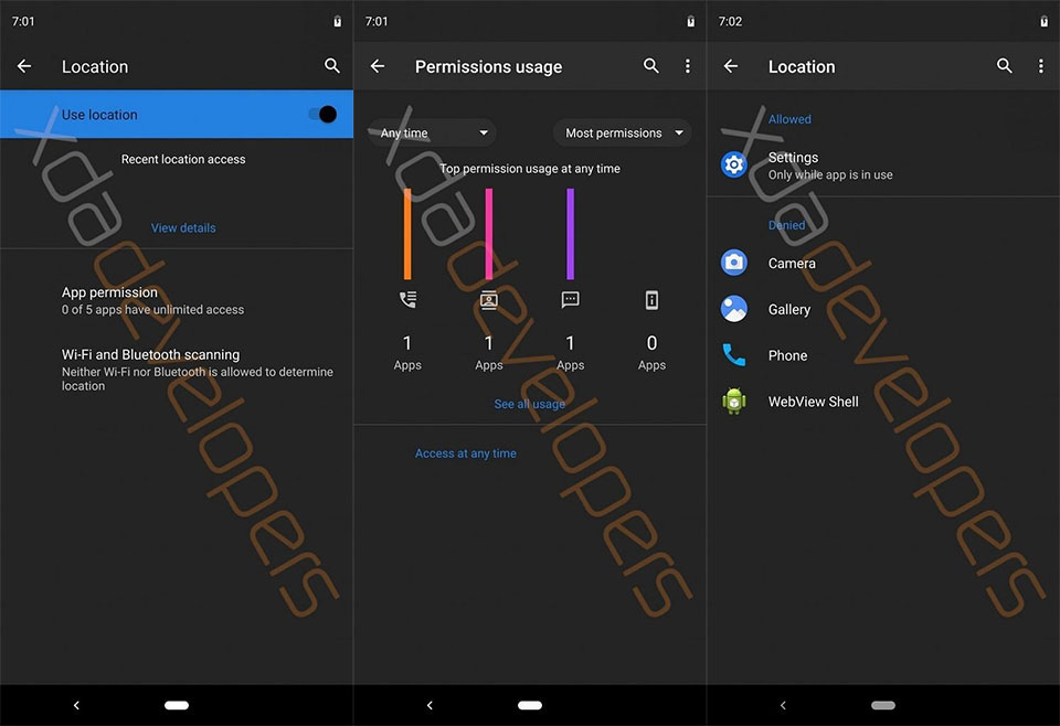 接下来是应用权限显示优化,以前拨打电话、获取位置等权限都是通过文字的形式呈现,在Android Q上则是以图标的形式出现,更加的直观。有些权限只有在需要的时候,弹框请求,比如定位,使用结束后会自动关闭该权限。