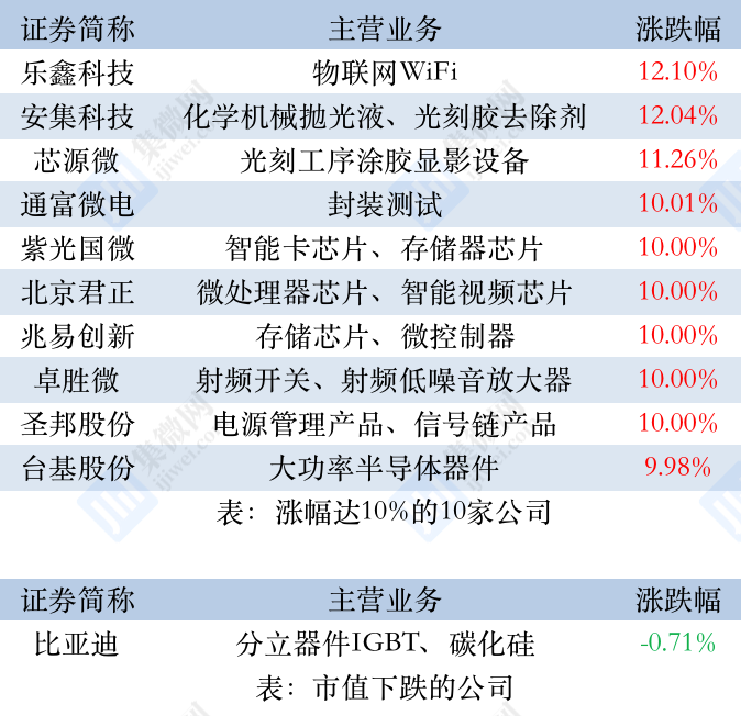 在105家半导体公司中,仅比亚迪一家公司市值下跌,其余公司全部上涨,其中乐鑫科技、安集科技、芯源微、通富微电、紫光国微、北京君正、兆易创新、卓盛微、圣邦股份及台基股份上涨达10%。