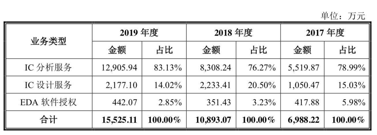 据上交所网站查询可知,芯愿景科创板IPO进入“已问询”状态。据招股说明书显示,公司为IC设计企业,主营业务是依托自主开发的电子设计自动化(EDA)软件,开展集成电路分析服务和设计服务。设立至今,公司已建立集成电路分析、集成电路设计及EDA软件授权三大业务板块。报告期内,公司主营业务收入占比如下:
