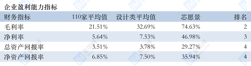 经计算,110家企业综合毛利率为21.51%,净利率为5.64%,总资产回报率为3.51%,净资产回报率为6.85%,其中设计企业综合毛利率为32.69%,净利率为7.53%,总资产回报率为3.78%,净资产回报率为7.50%。据wind数据,芯愿景毛利率为74.63%,净利率为46.98%,总资产回报率为29.27%,净资产回报率为35.97%,四项指标在110家企业中的排名分别为第2名、第3名、第4名和第4名。