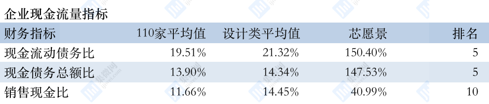 经计算,110家企业综合现金流动债务比为19.51%,现金债务总额比为13.90%,销售现金比为11.66%,其中其中设计企业综合现金流动债务比为21.32%,现金债务总额比为14.34%,销售现金比为14.45%。据wind数据,芯愿景现金流动债务比为150.40%,现金债务总额比为147.53%,销售现金比为40.99%,三项指标在110家企业中的排名分别为第5名、第5名和第10名。