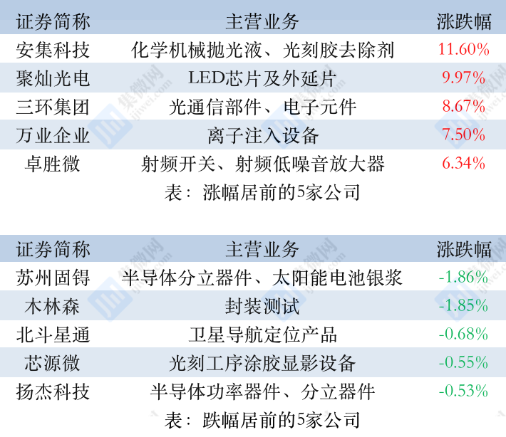 在110家半导体公司中,有98家公司市值上涨,其中安集科技、聚灿光电、三环集团、万业企业、卓胜微涨幅居前;有11家公司市值下跌,其中苏州固锝、木林森、北斗星通、芯源微、扬杰科技跌幅居前。