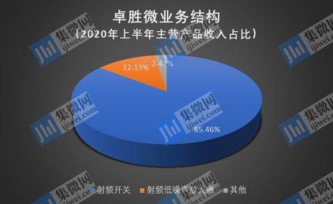 其中,卓胜微专注于射频集成电路领域的研产销,主要向市场提供射频开关、射频低噪声放大器、射频滤波器等射频前端分立器件及各类模组的应用解决方案。根据应用场景的不同,其滤波器产品分为用于卫星定位系统的GPS滤波器、用于无线连接系统前端的WiFi滤波器、适用于移动通信的滤波器等,上述产品主要应用于智能手机等移动智能终端。2020年上半年,其主营产品射频开关、射频低噪声放大器及其他的营收占比分别为85.46%、12.13%和2.41%。