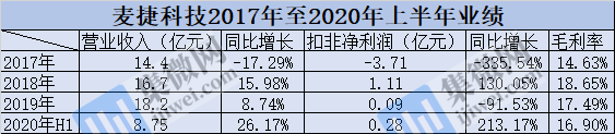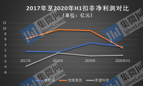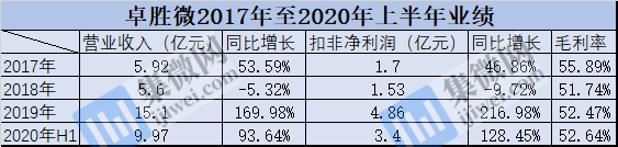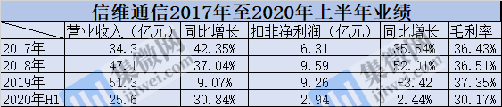 来看各企业的业绩情况,据企业年报,集微网分别统计出三家企业2017年至2020年上半年的营收、扣非净利润、增长率及毛利率情况如下: